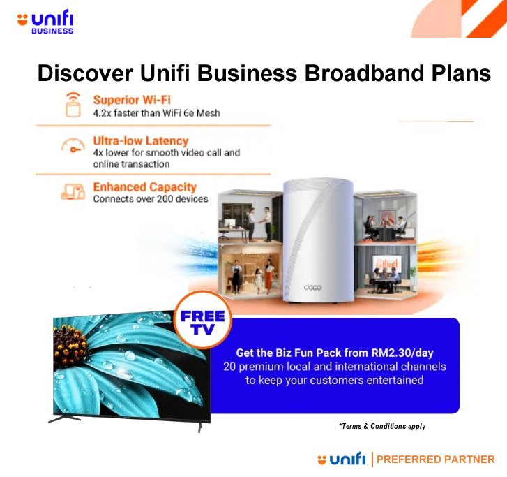 – Unifi Business Broadband – Virtual Office. Support up to 10+ users on Multiple Devices Unifi Business Broadband Plan-500Mbps RM 239/mth