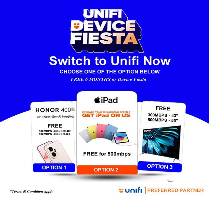 -500 Mbps-RM149/month (FREE Honor 400 5G) with 36 months Contract